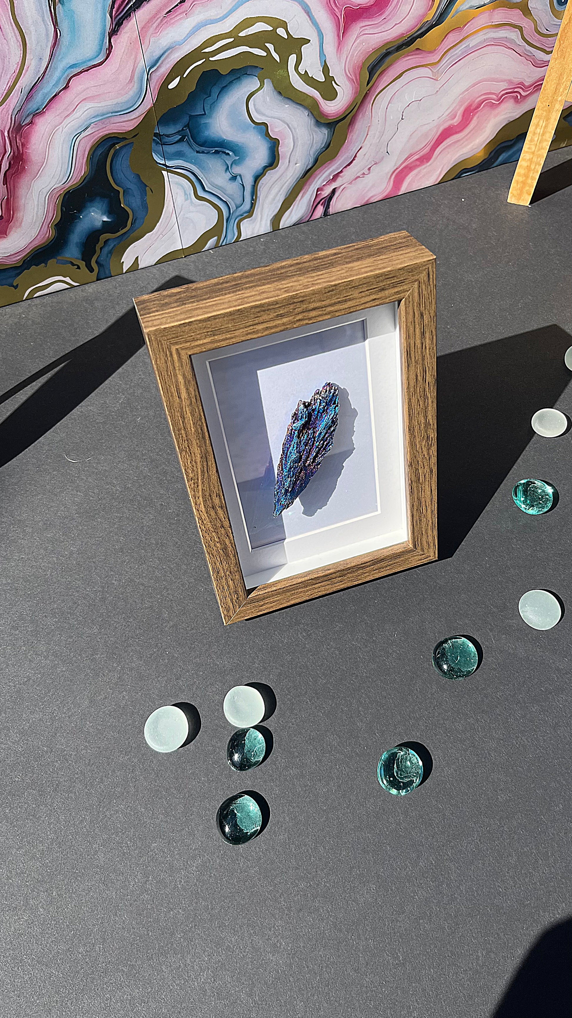 This natural Black Tourmaline, electroplated to reveal a brilliant blue sheen and finished with a feather-like flame detail, is framed in a rich dark wood-look that intensifies its mystery and power. The darker tones emphasize the electric shimmer of the crystal, giving it a moody, sculptural presence.