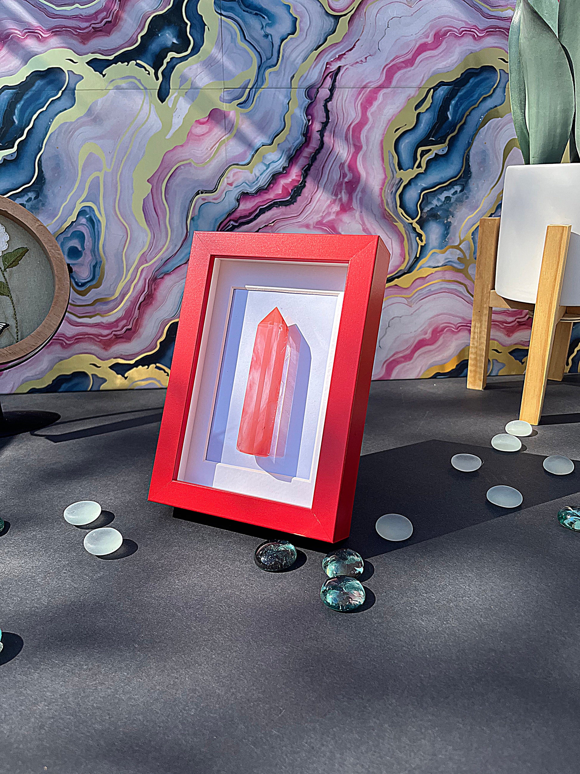 Vibrant and full of fire, this Red Carnelian Point is framed in a matching red tone for a striking, monochromatic look. The crystal’s rich, fiery shades of orange and deep red flow through its polished quartz form, giving it a sense of movement and intensity. Paired with the solid structure of the obelisk shape and frame, it becomes a centerpiece of energy and style.
